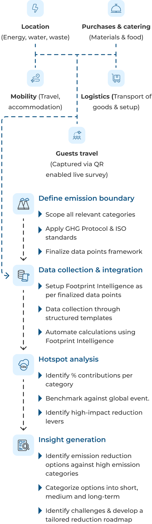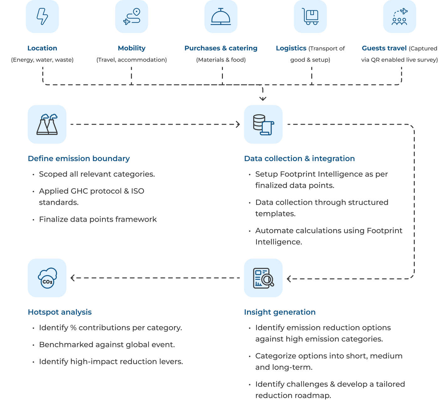 AGS designed a tailored data model aligned with the GHG Protocol, ISO 14067, and the Net Zero Carbon Events Roadmap, mapping emissions across five major categories: location, attendee mobility, purchases and materials, catering, and logistics.