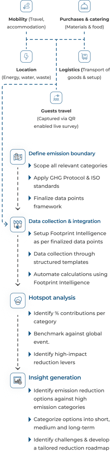 AGS led a full-spectrum GHG emissions assessment of the SIC Awards; combining technical depth, multi-stakeholder coordination, and region-specific expertise. AGS designed the data model, aligned it with the GHG Protocol, ISO 14067, and the Net Zero Events Roadmap, and mapped emissions across five key categories: venue, mobility, purchases & catering, logistics, and attendee travel.